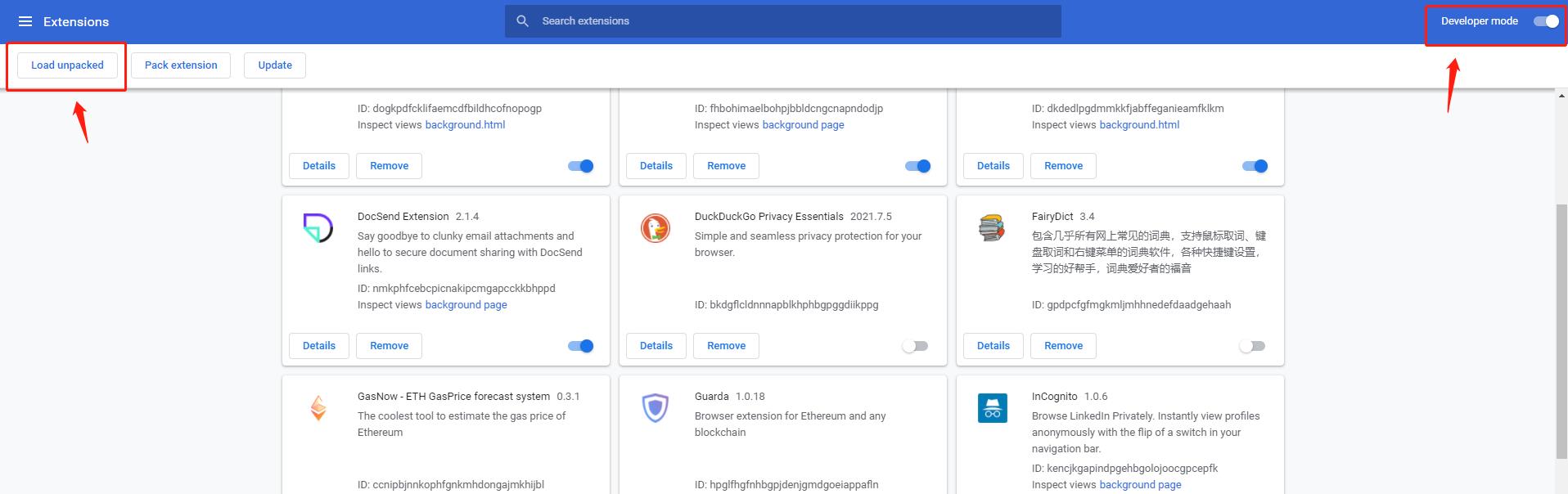 chrome://extensions/- Open the switch of developer mode, select to load the unzipped extension program, import the unzipped catalogue of the 2nd step.