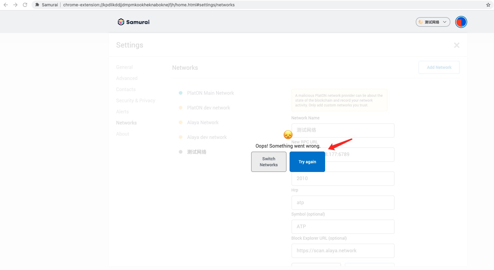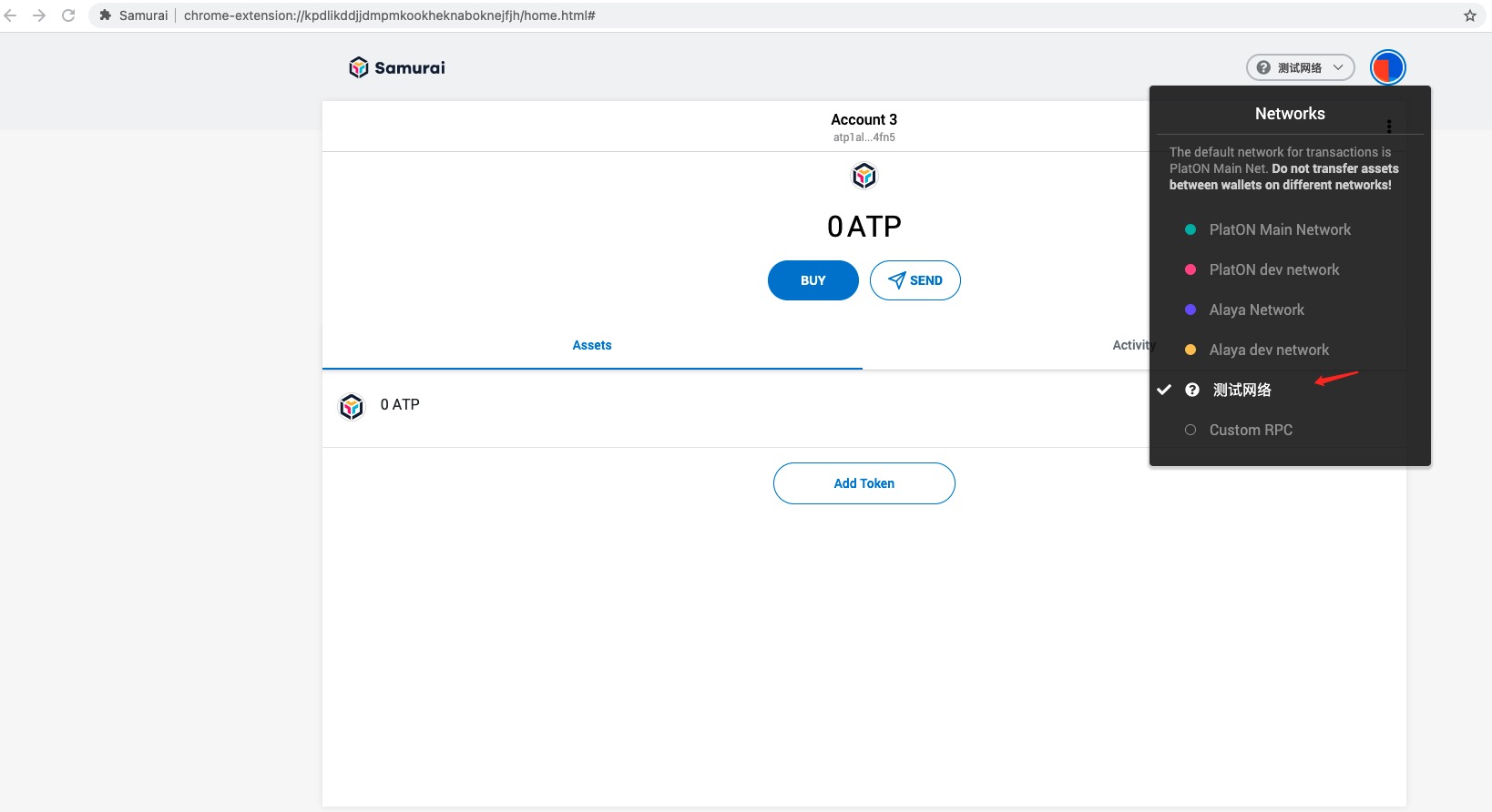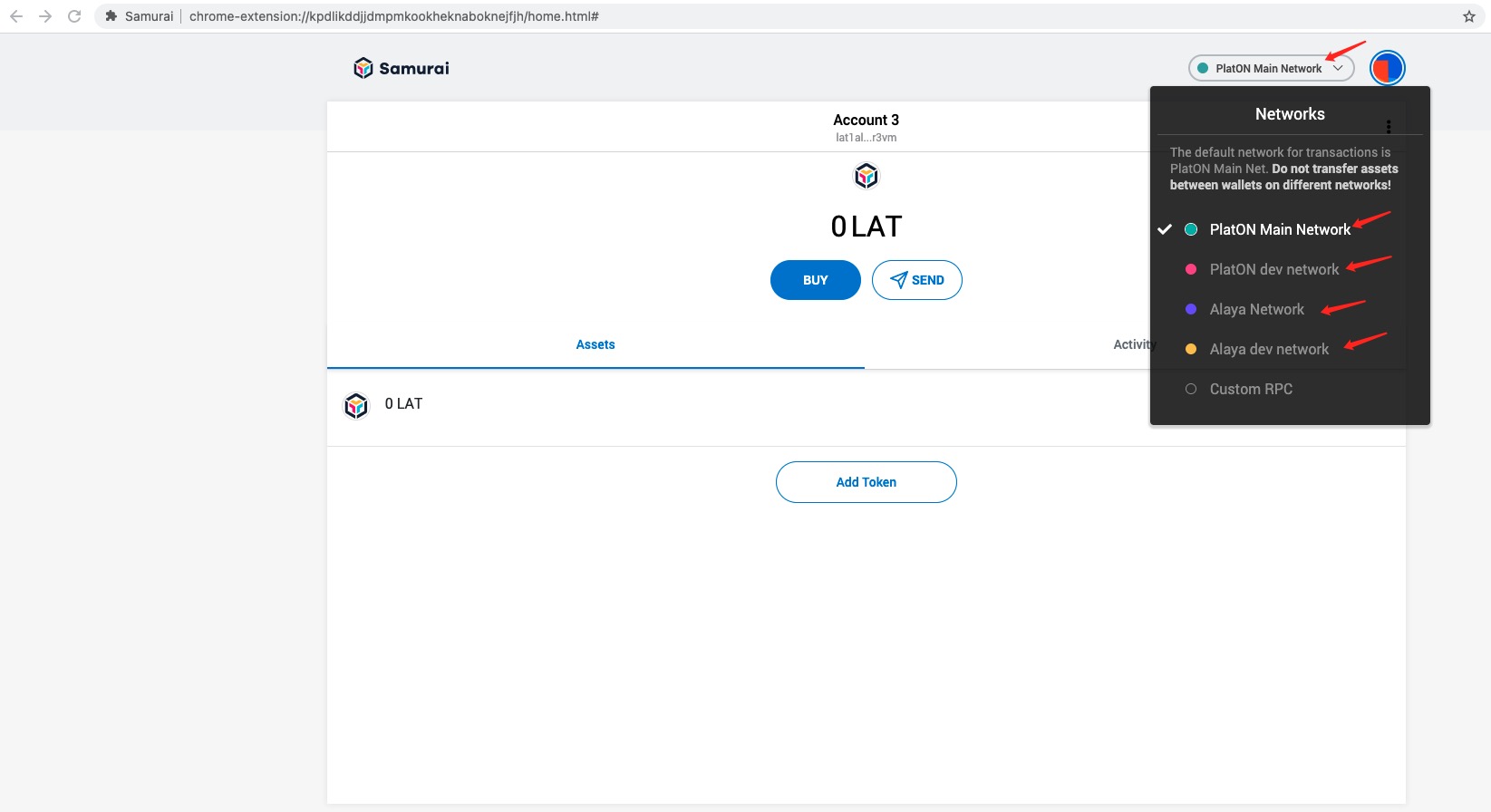 Samurai have added PlatON Main Network, PlatON dev network, Alaya Network, Alaya dev Network as default, you can choose a network to connect. Click “Networks” and choose a network from the four networks to connect.