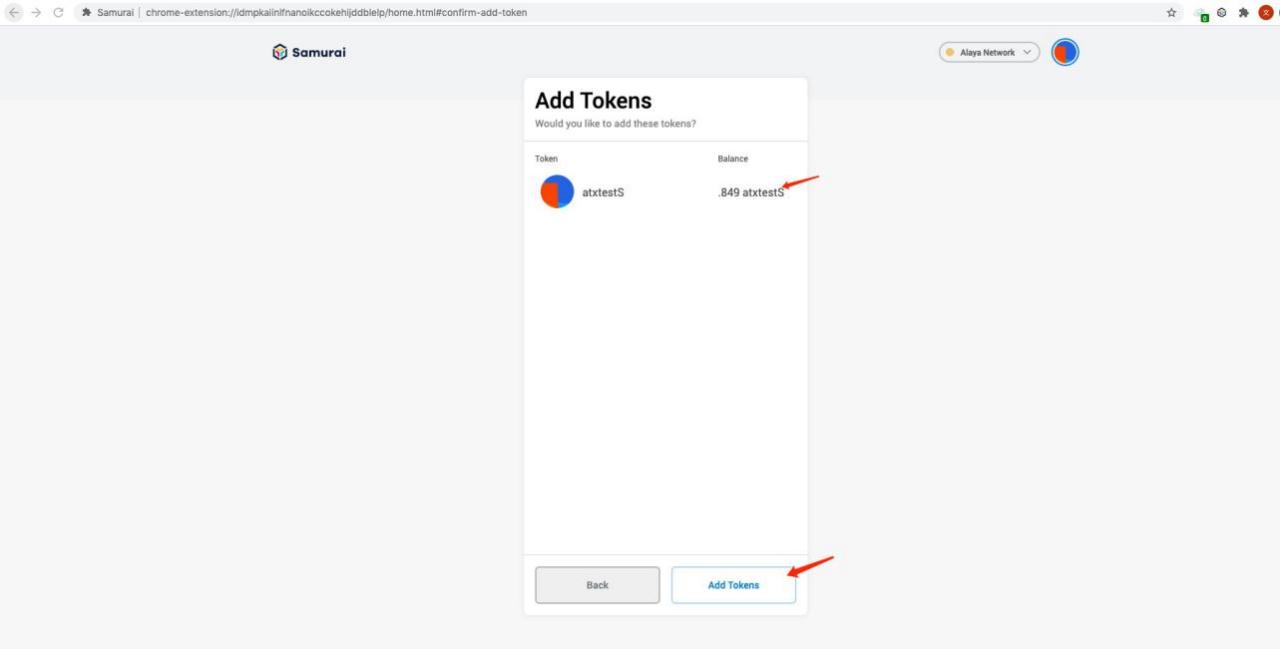 - Enter the confirm page of Add Tokens, there will show the balance of this token under this account, click “Add Tokens”to add successfully.