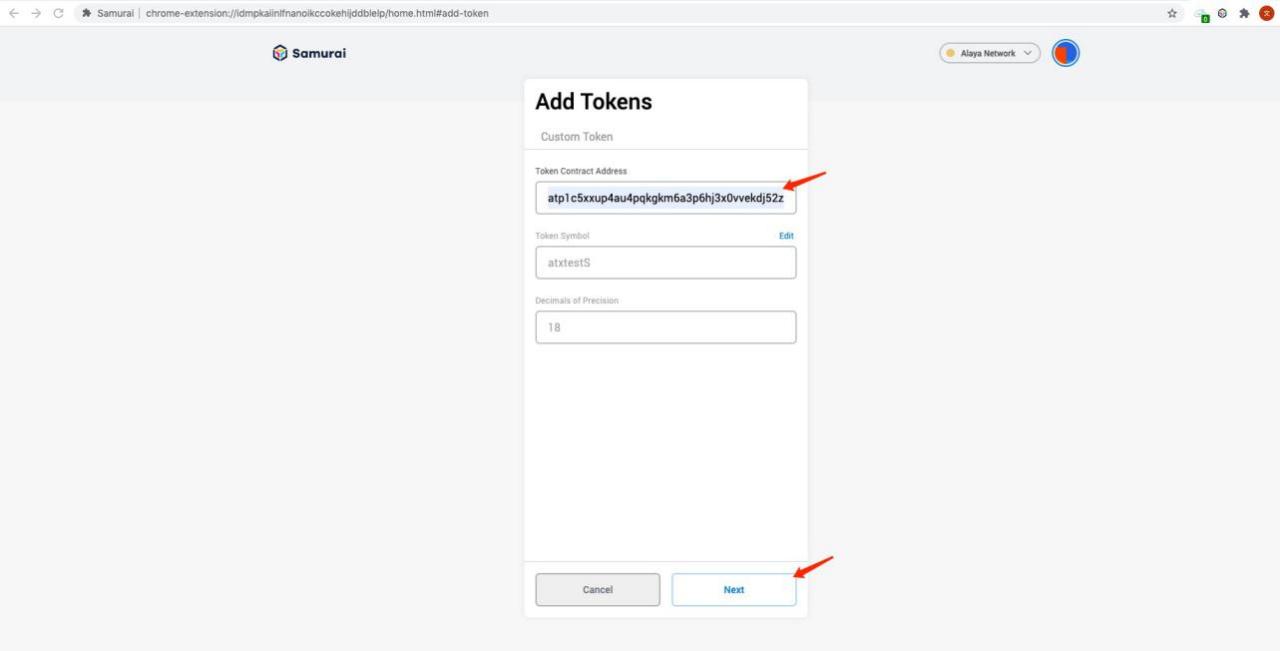 - Pop-up the “Add Tokens” page, add the existed Token Contract Address of connected network, Samurai will automatically to get token’s symbol and exact decimal point, click “Next” when you completed all the steps.