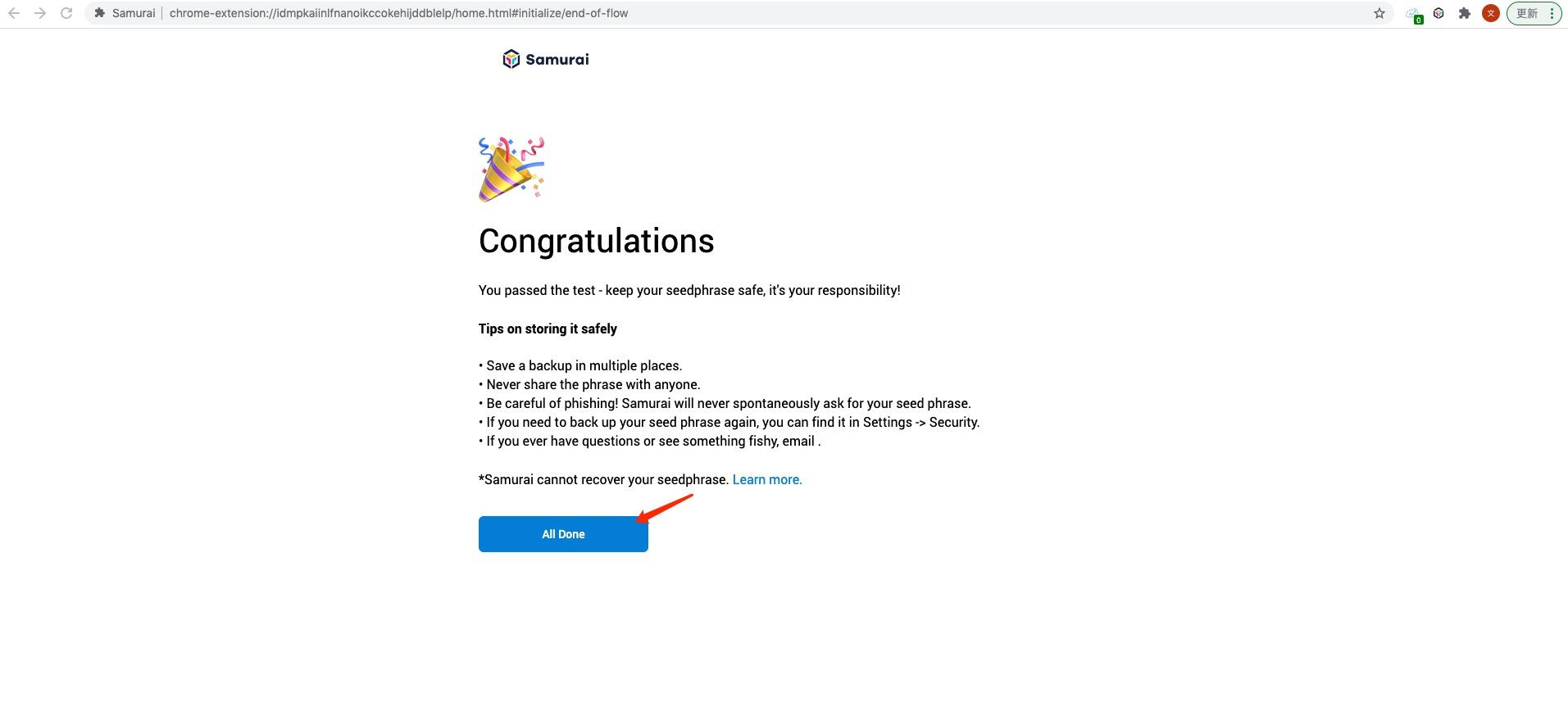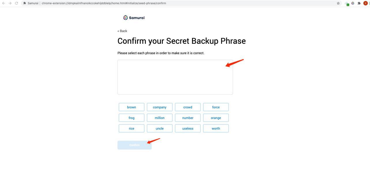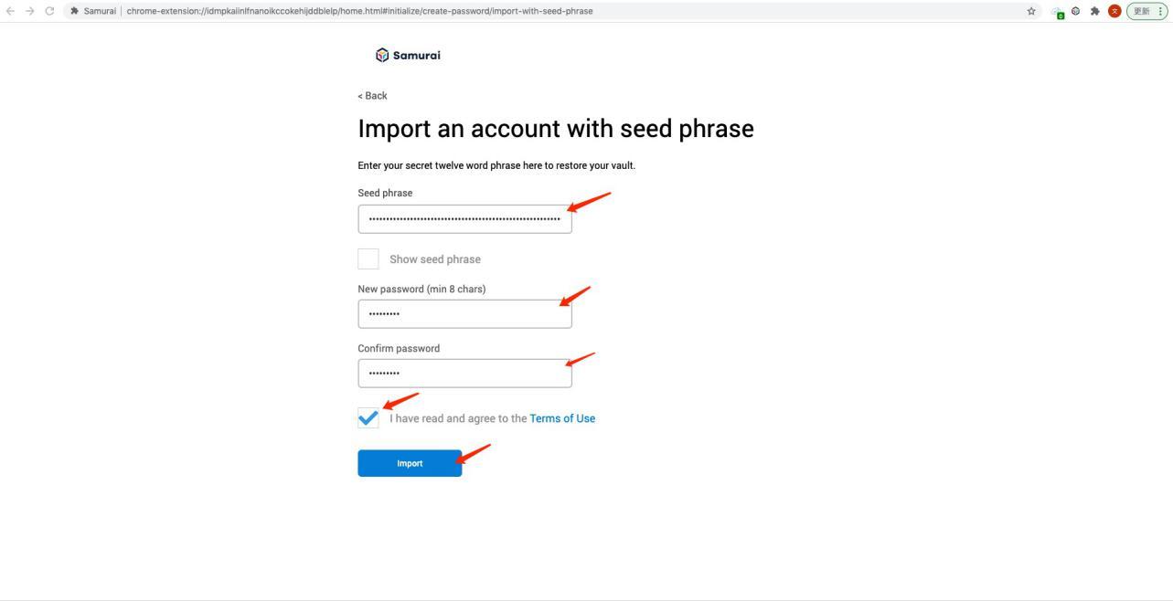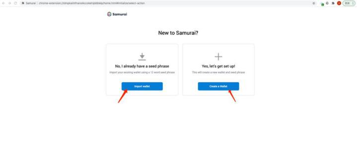 Note: The current Samurai mnemonic phrase generation path has problems, and the import of mnemonic phrases generated by external wallet applications is not supported. It is recommended to import it through the private key after the initial creation.