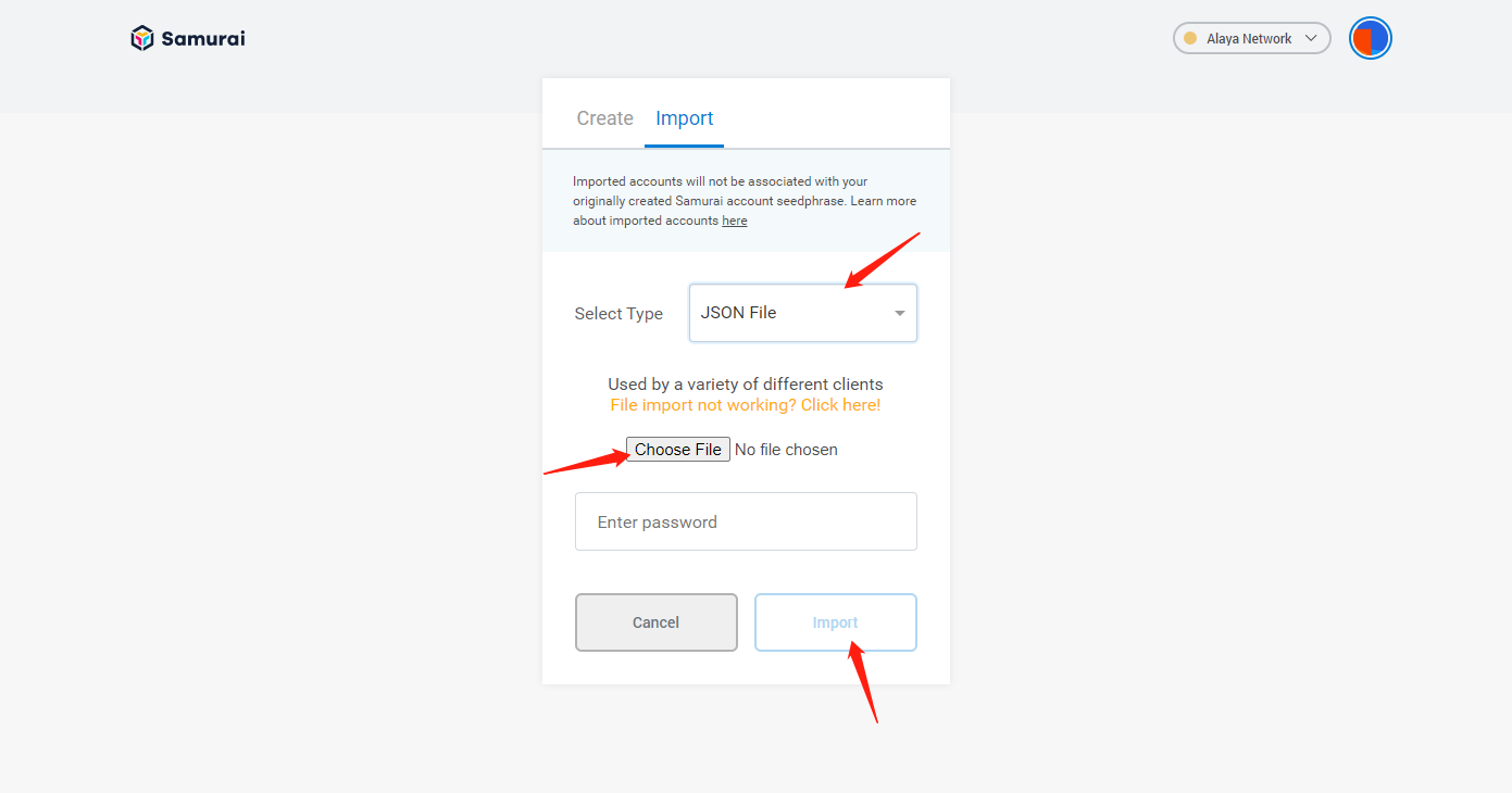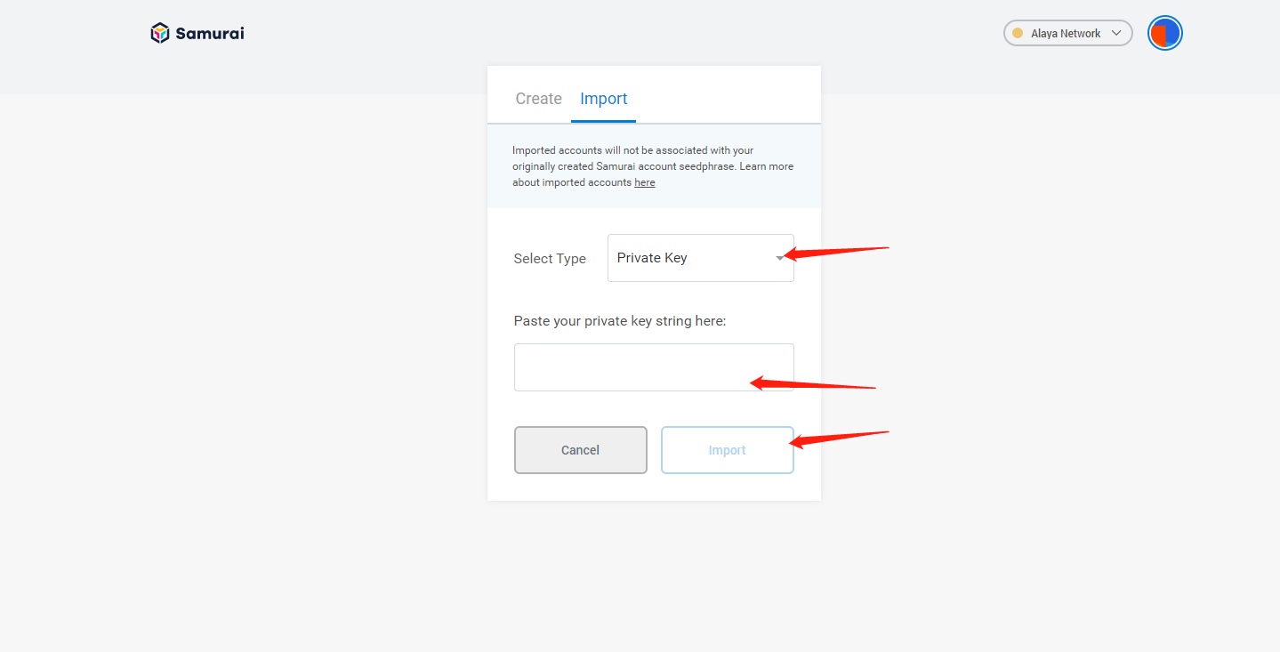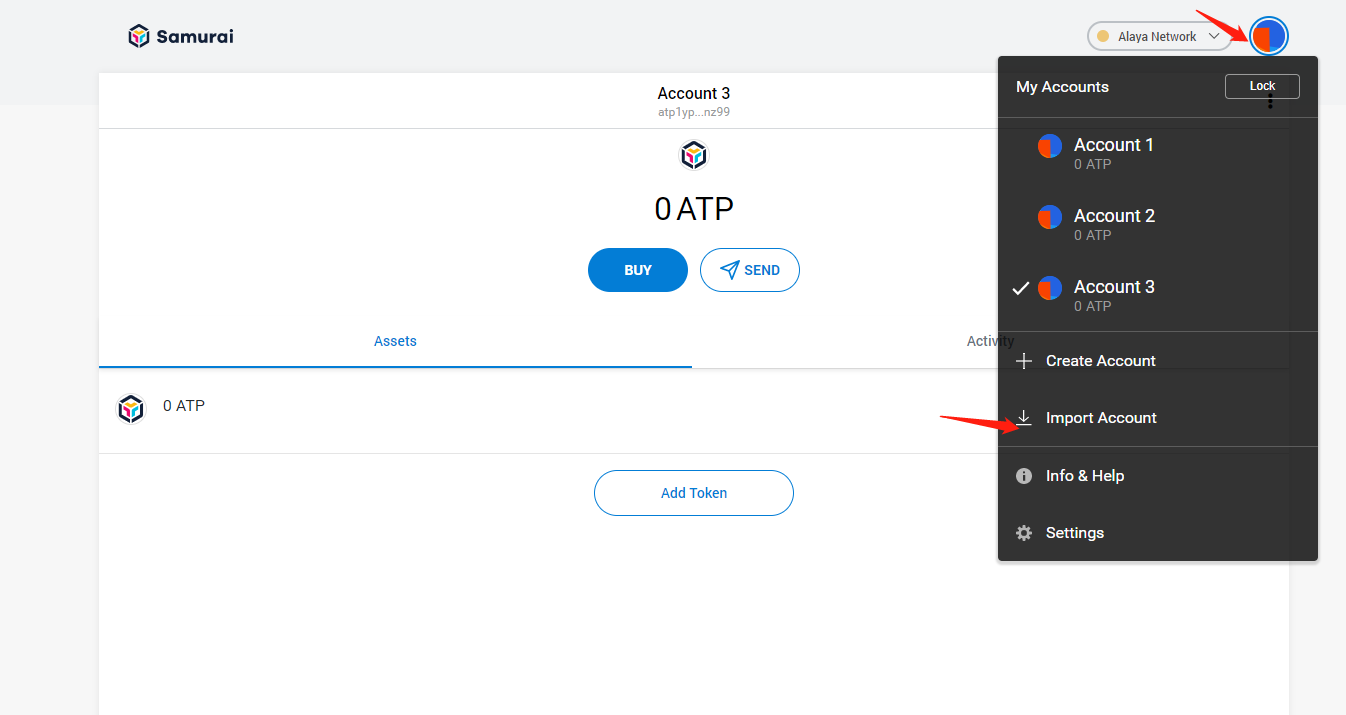- Click on the wallet avatar at the top right of the Samurai page and in the drop down menu that appears click on import account.