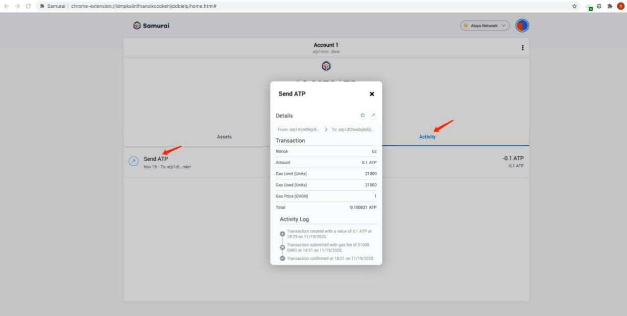 - Click “Confirm” to complete the sending of ATP, and you can view the transaction status in the Activity on the mainpage.