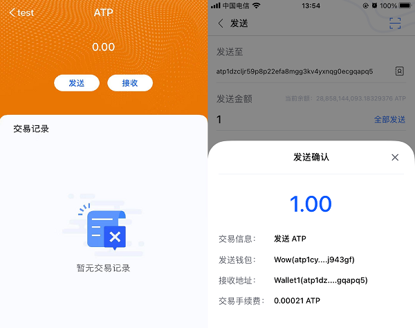 2. 钱包信息包含余额、单位和锁仓余额,以及【发送】按钮和【接收】按钮。
