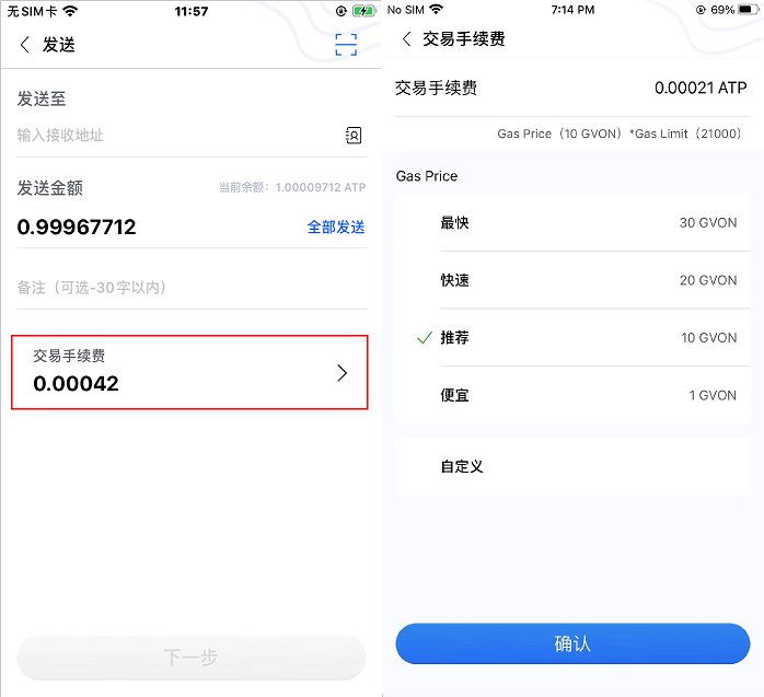 4. 选择交易手续费,可自行选择不同数量的手续费。