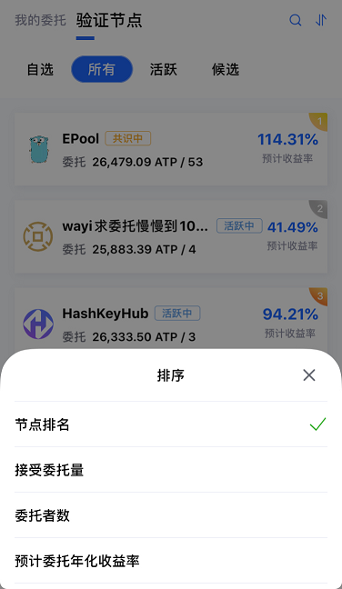 2. 节点默认是按照排名进行排序,可支持接受委托量、委托者数、预计委托年化收益率排名。