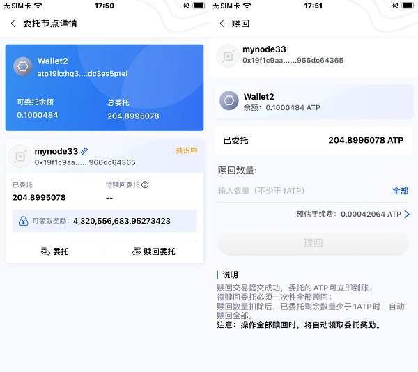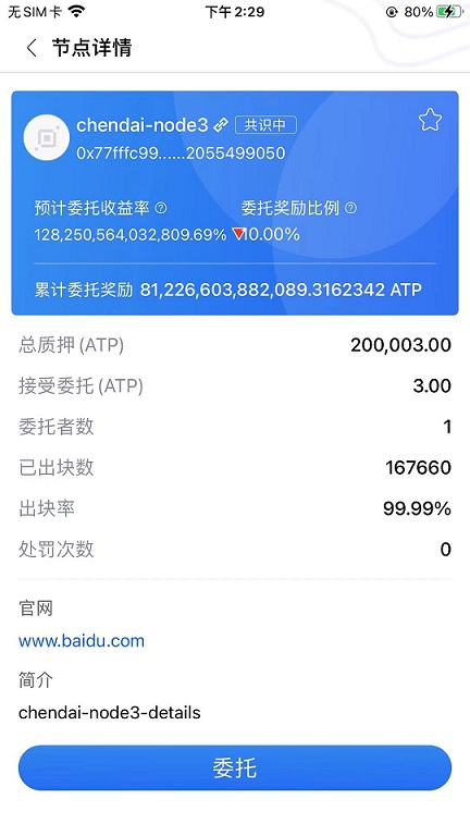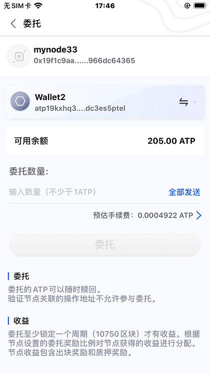 3. 如果您想将ATP质押给此节点,可点击下方【委托】按钮进行操作。