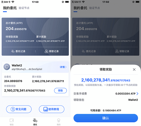 1. 点击【委托-我的委托】可查看当前客户端钱包总的委托金额、待领取奖励和累计奖励。