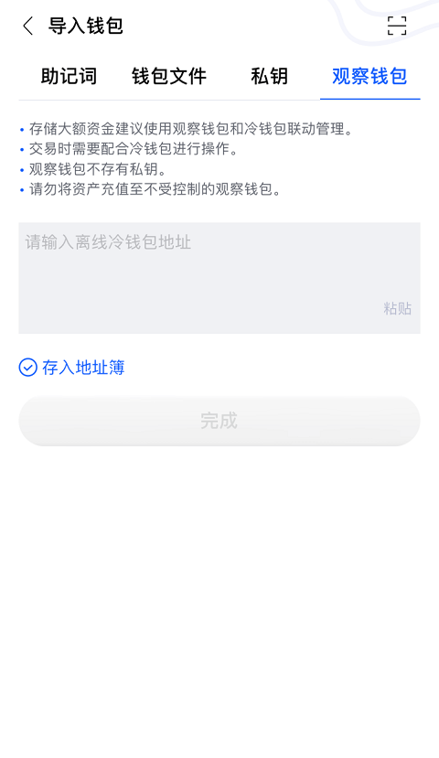 2. 如图所示,联网手机点击【导入钱包-观察钱包】,扫描不联网手机的二维码或者输入钱包地址,点击【完成】,观察钱包设置成功。