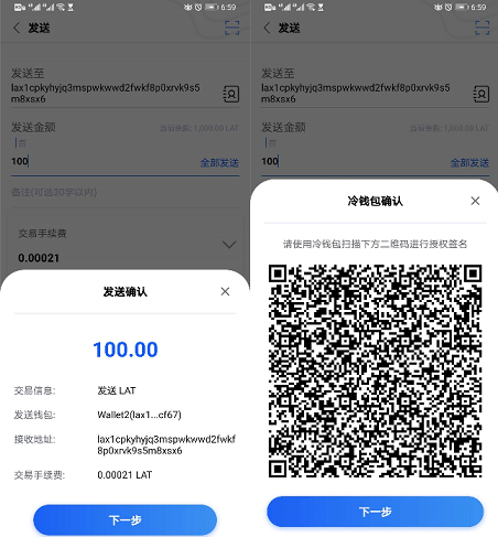 4. 点击【下一步】,确认交易信息,点击【发送交易】输入正确的钱包密码,即可发送交易至区块链网络。