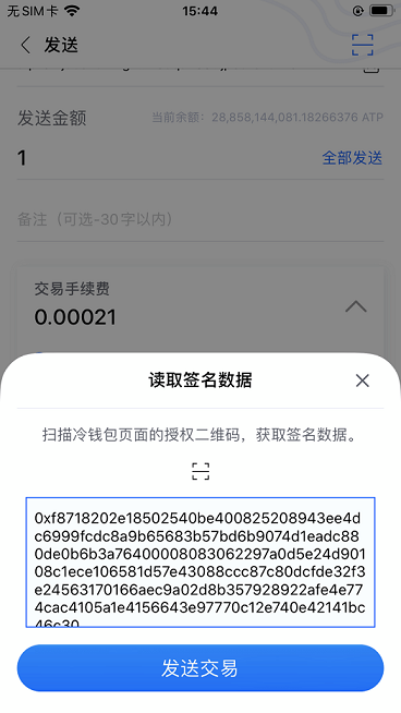 (3)点击扫一扫图标,扫描步骤2冷钱包页面的二维码,则可获取签名数据。