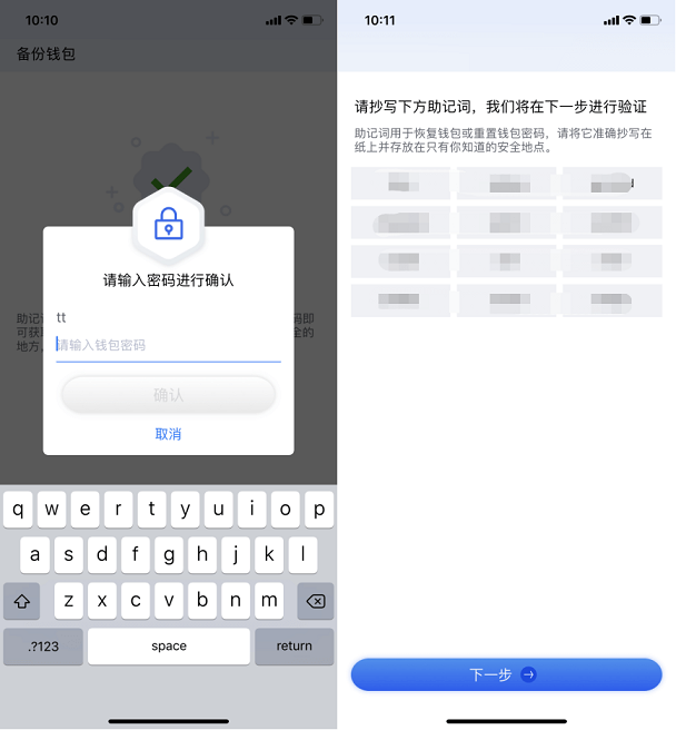 3. 抄写助记词并保存在安全地方。点击【下一步】验证助记词,验证通过则完成了钱包备份。