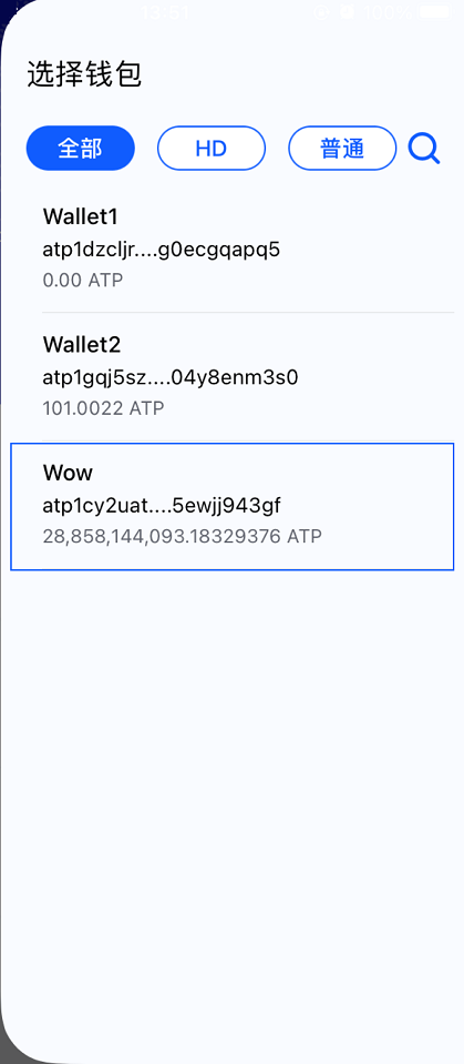 2. 可按“全部”、“HD”、“普通”进行分类筛选,也可通过钱包名称模糊搜索或钱包地址进行精确搜索。