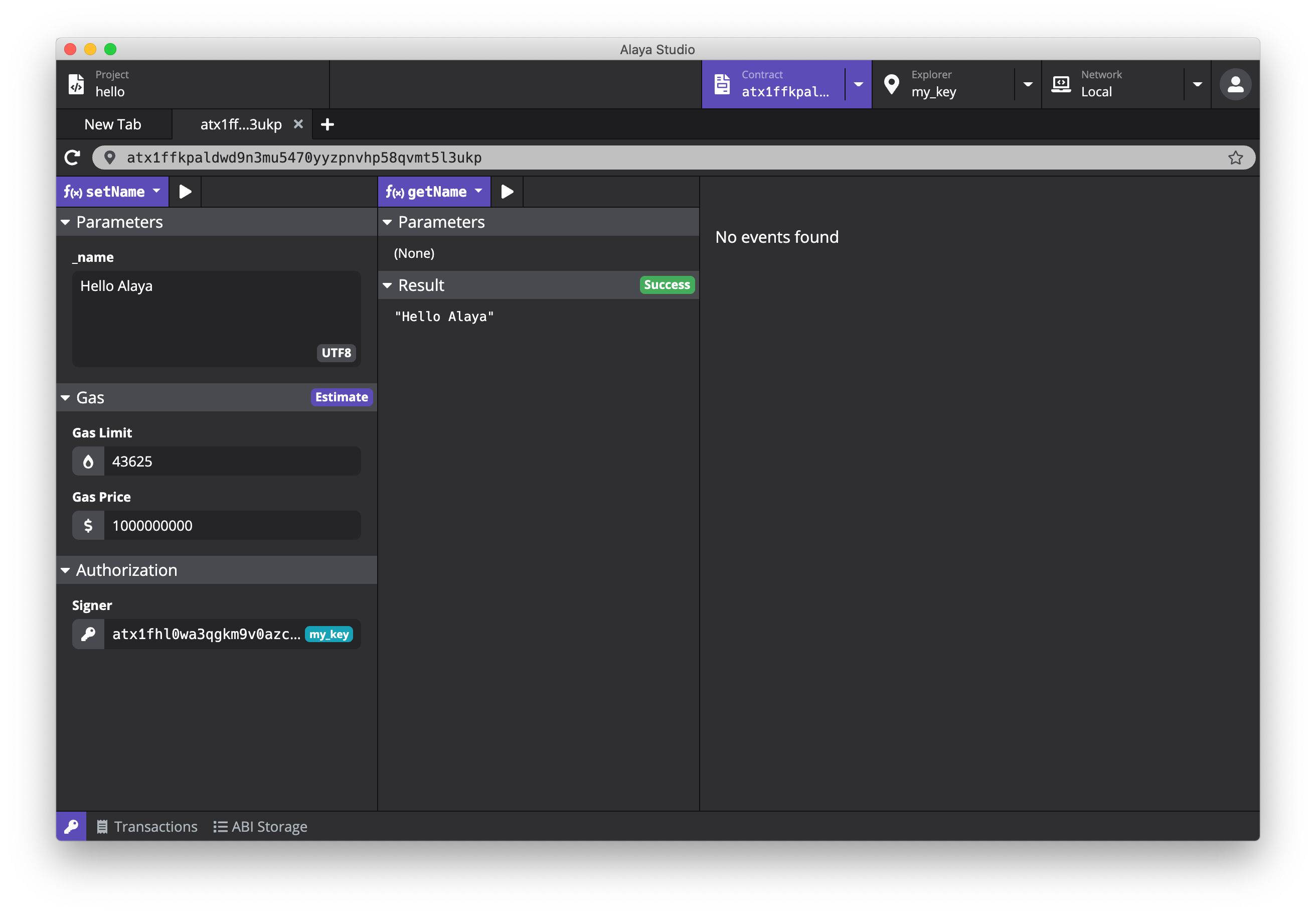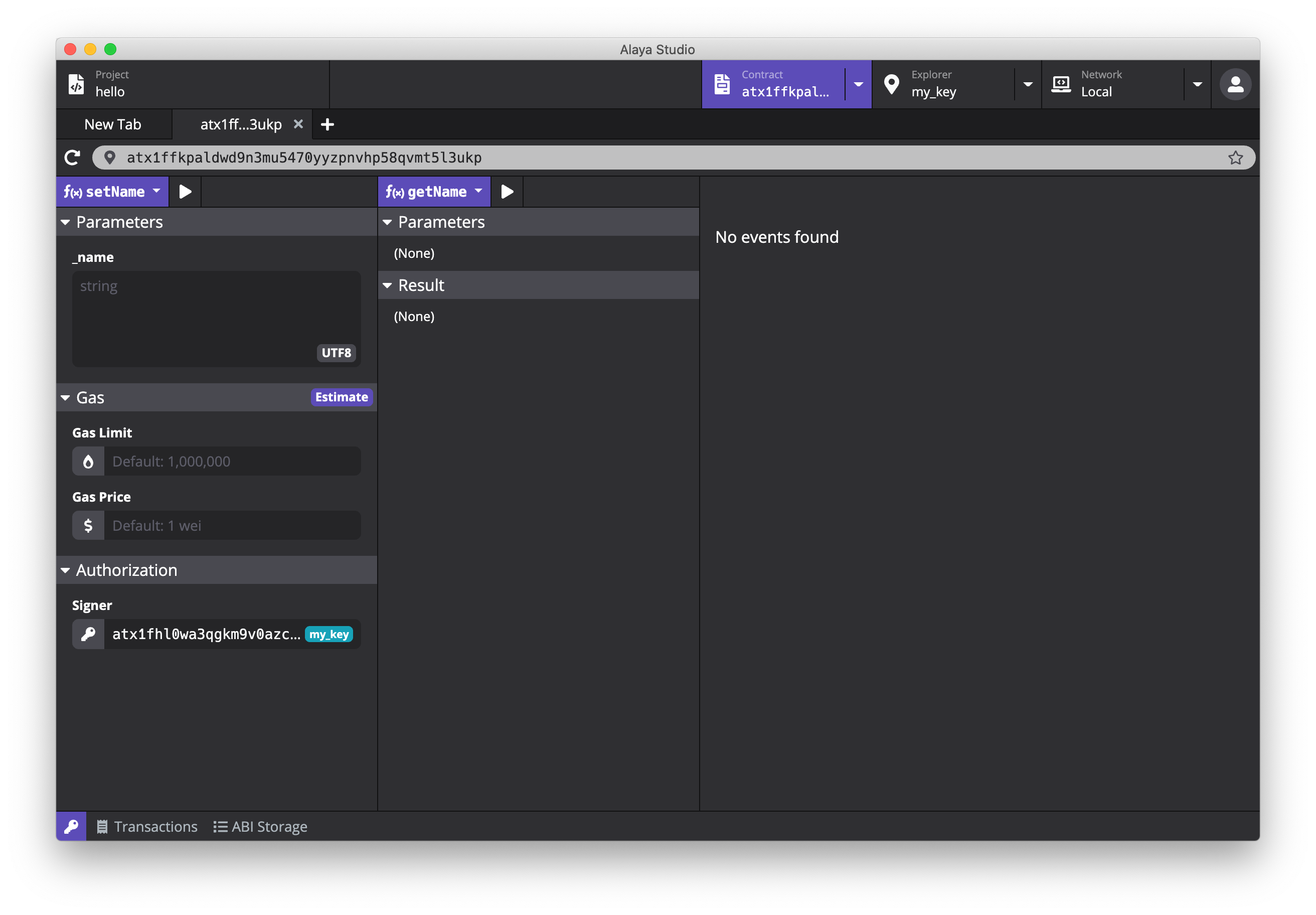 在左边栏,选择 setName 方法,在 Parameters 下填入 _name 参数的值,例如 Hello Alaya。点击 estimate 按钮,PlatON Studio 会自动估算这笔交易所需要的手续费。在 Authorization 中选择为交易签名的地址后,点击上方的执行按钮,即可发送调用写入方法的交易。交易发送后也将同步到底部栏的 Transactions 列表中,方便查询交易执行状态,或之后查询交易详情数据(例如调用合约的地址、方法、参数、及交易等数据)。