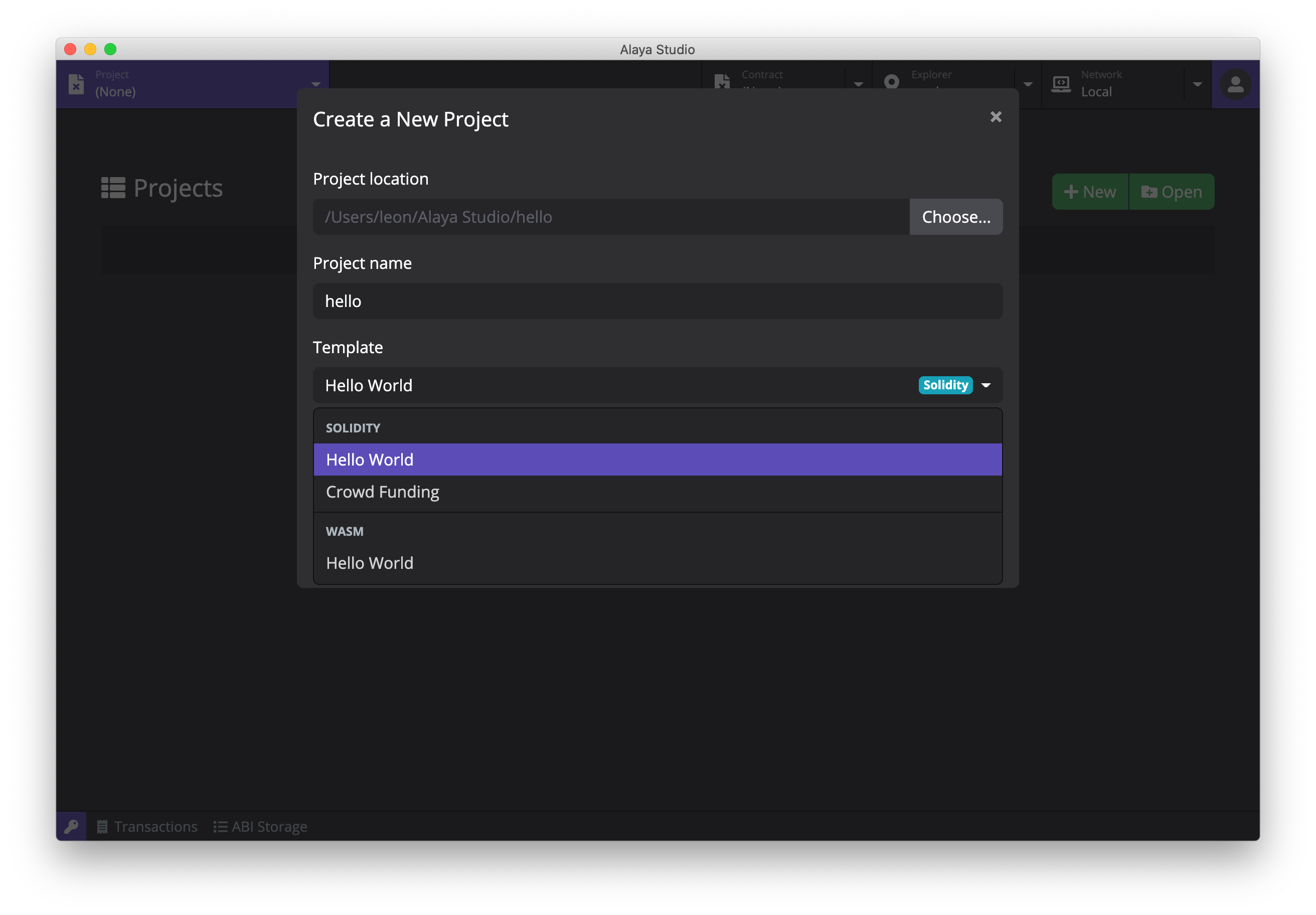 点击顶部的 Project 标签,切换至合约项目界面。点击页面右上角的 New 按钮打开创建项目弹窗,输入项目名称并选择合适的模版,PlatON Studio 目前提供了多个模版: