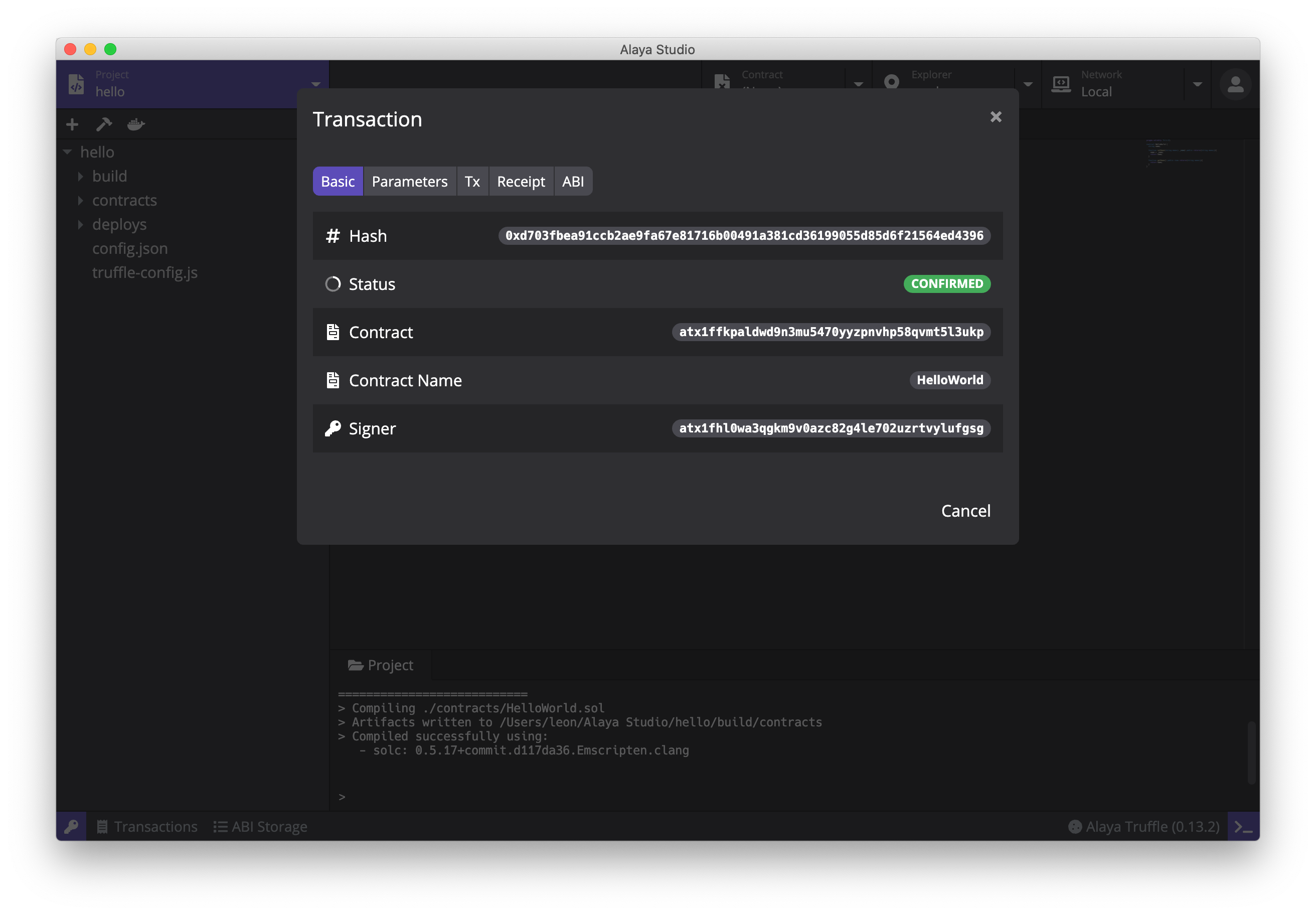 合约部署成功后,PlatON Studio 将弹出交易详情弹窗,显示合约部署的结果,包括交易哈希、已部署合约的地址、参数、部署交易、Receipt、ABI 等等相关数据。