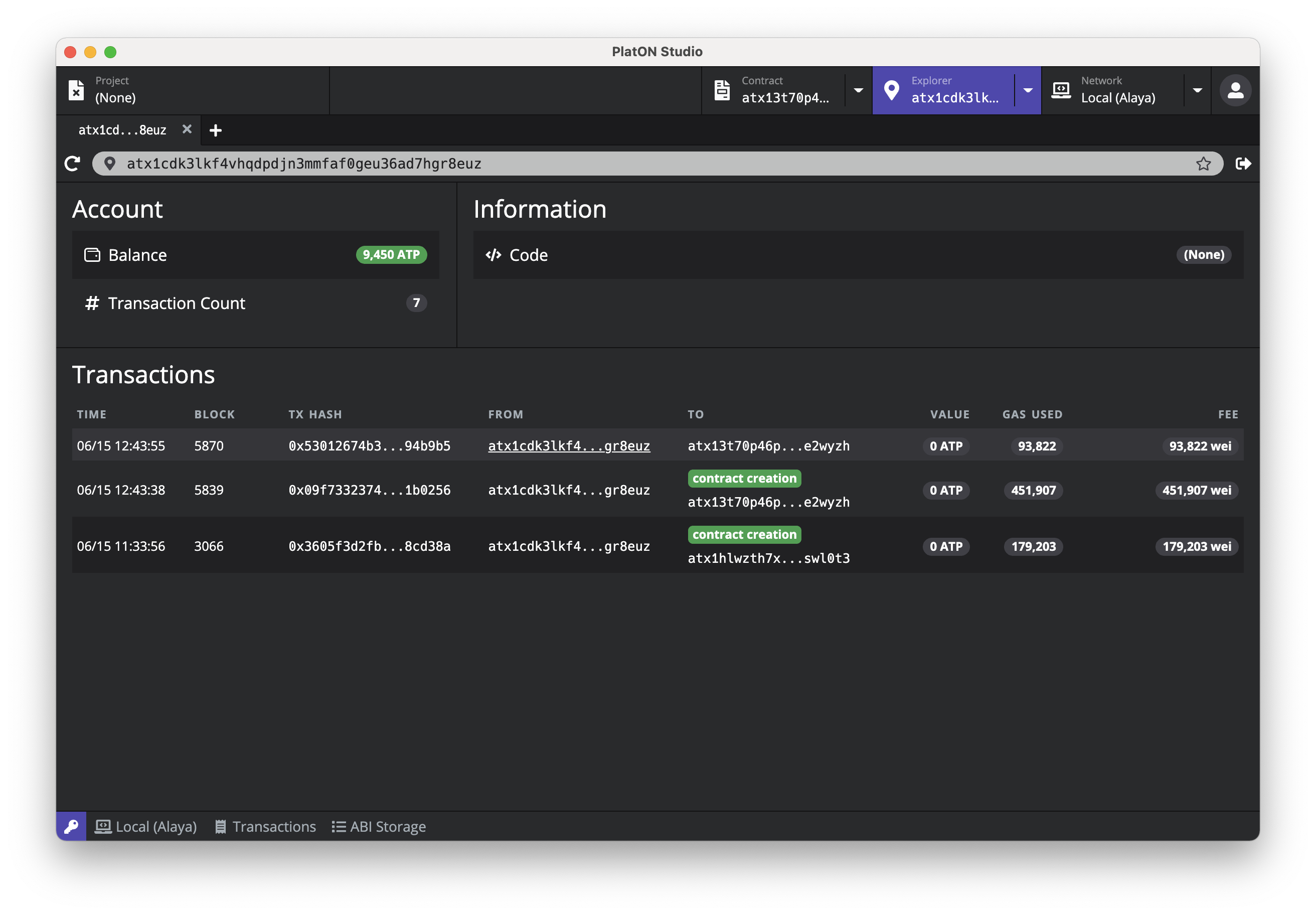 成功部署智能合约后,点击交易详情弹窗中 Contract 旁的地址,PlatON Studio 将切换至合约浏览器,并自动打开刚部署完成的智能合约。你也可以点击顶部的 Contract 标签切换至合约浏览器,在地址栏中输入希望打开的合约地址。PlatON Studio 支持同时打开多个合约,方便进行多合约的调试工作。