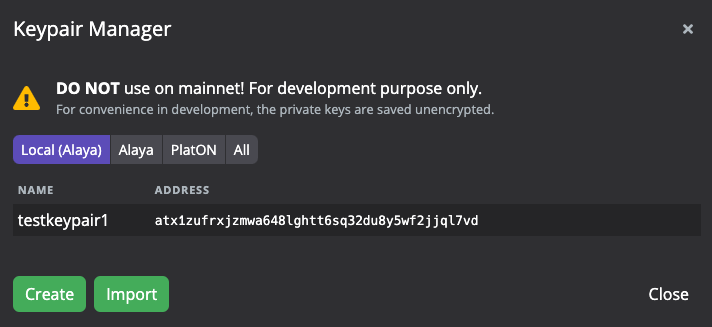 你可以在密钥管理器中创建、导入并管理密钥对。PlatON Studio 支持对 PlatON、Alaya、和本地开发网络,分别储存不同地址格式的秘钥对(分别以lat、atp、atx作为地址开头)。在创建和导入密钥对的时候,可以选择使用私钥或助记词两种形式创建。你还可以为该密钥对设置别名,方便在后续的使用中进行识别。