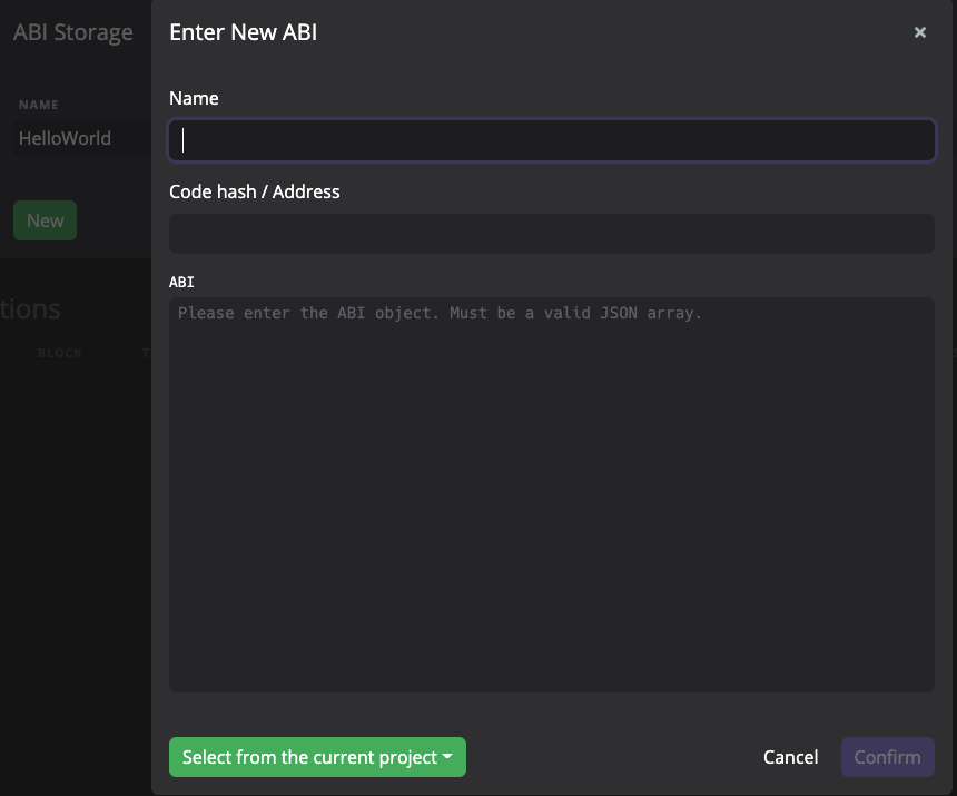 为方便使用,PlatON Studio 也会自动读取当前项目中,已编译过合约的 ABI,从 Enter New ABI 弹窗左下角的按钮中即可选择。