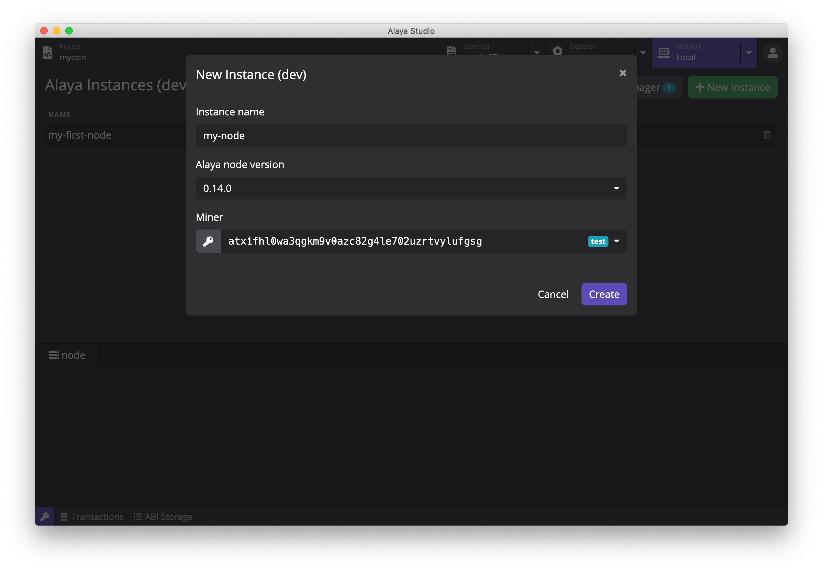 点击主页面中右上角的 New Instance 按钮打开创建新实例的弹窗,填写实例名称和选择合适的版本,点击 Create 按钮完成节点实例的创建。创建节点实例时间比较长 可能需要等待十几秒钟。