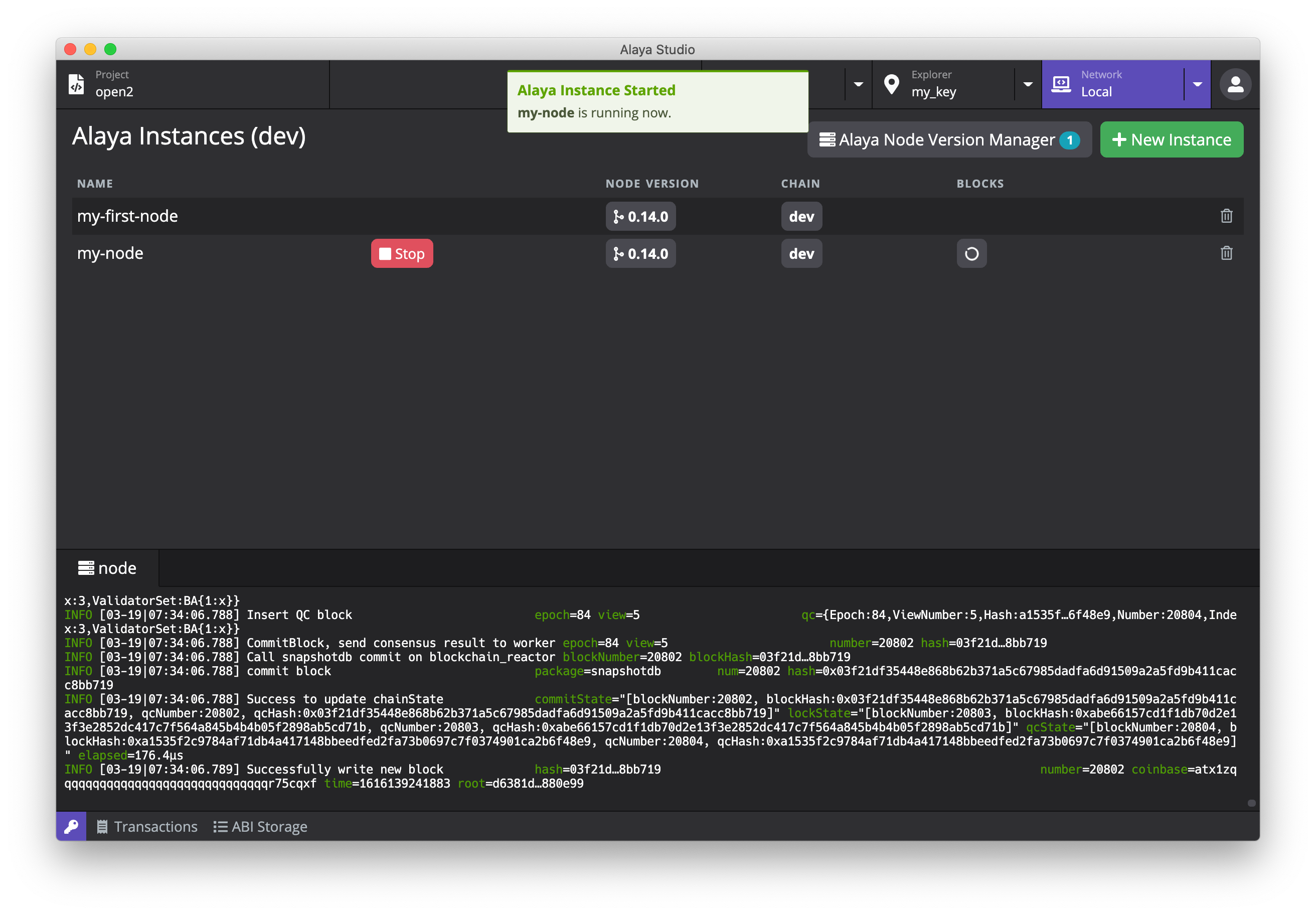 节点实例创建完成后,实例列表将显示刚刚创建好的实例,点击实例的绿色 Start 按钮启动本地节点。启动完成后,你可以在下方的日志查看器中检查节点运行日志。