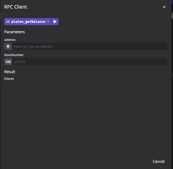 PlatON Studio 还提供了直接从底层调用 PlatON/Alaya 节点 RPC 接口的功能。点击底部栏的网络按钮,在弹出菜单中选择并打开 RPC Client 后,可以看到 PlatON/Alaya 节点的全部 RPC 接口。对每个 RPC 接口,PlatON Studio 也将生成对应的参数表格,填写数据后点击运行按钮,即可完成调用并查看返回数据。