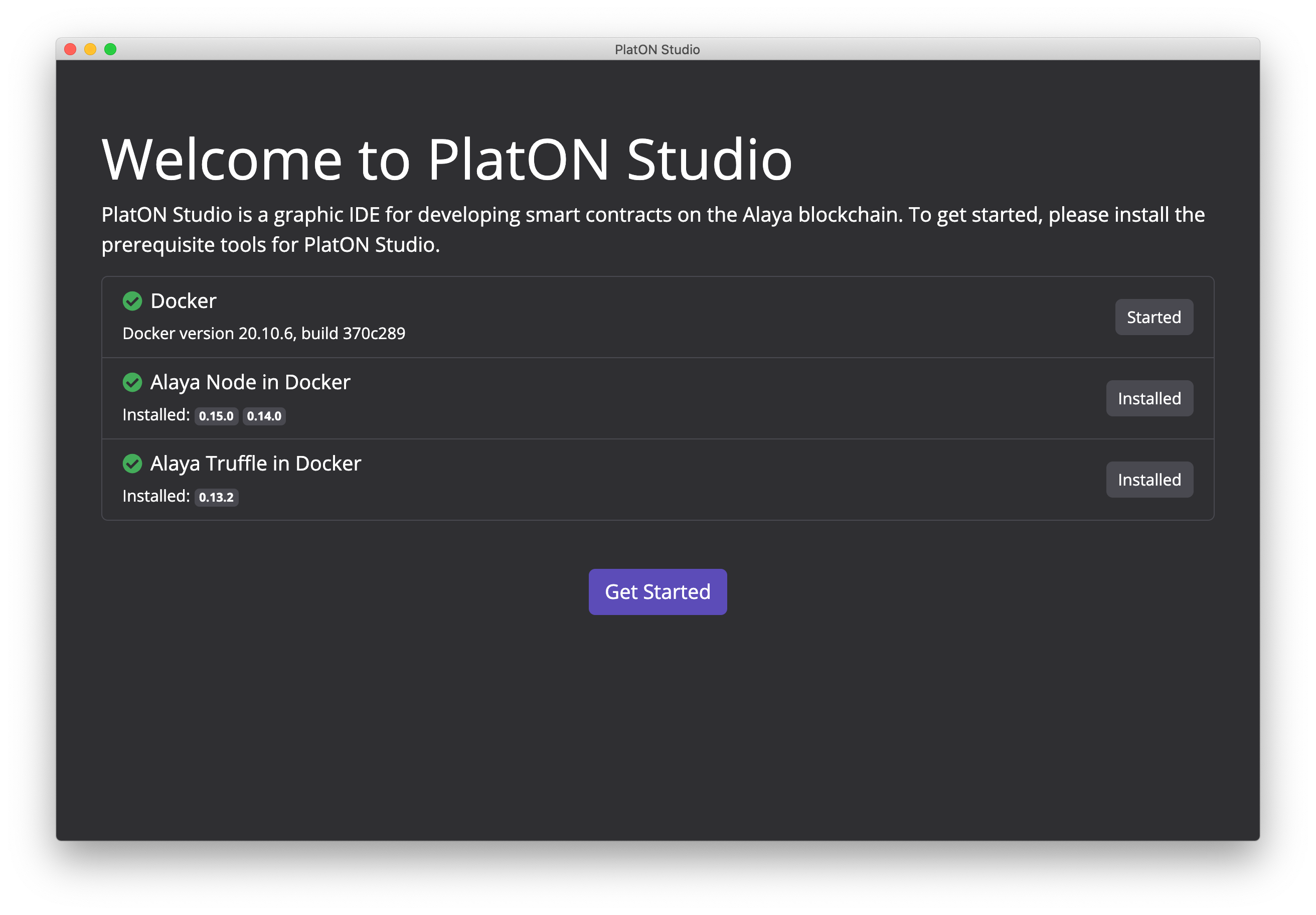 在正确安装 PlatON Studio 并初次启动时,你将看到一个欢迎页面,这里有 PlatON Studio 正常运行所需要的依赖,包括了 Docker,Alaya Node 以及 Alaya Truffle。