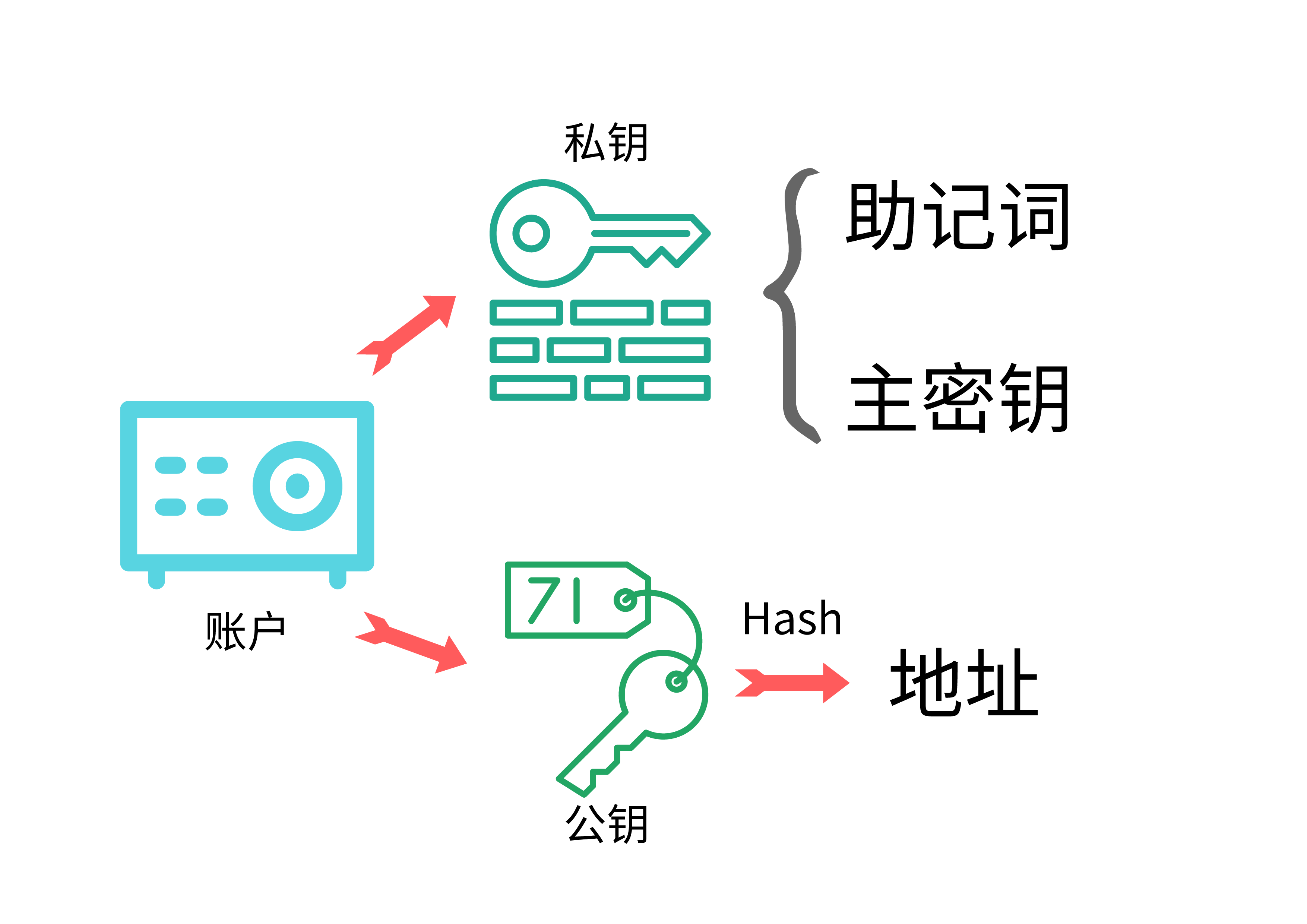 私钥:私钥可以完全控制账户,所以私钥要妥善保存。私钥有两种表现形式:助记词(Mnemonic)和主密钥(Master Key)。助记词是12个单词,主要作用是帮助你记住密钥。请注意,如果你的助记词泄露,那么你的密钥就已经泄露。主密钥是一个64位16进制数。这个密钥一般在程序中使用,人为使用或记忆比较难。