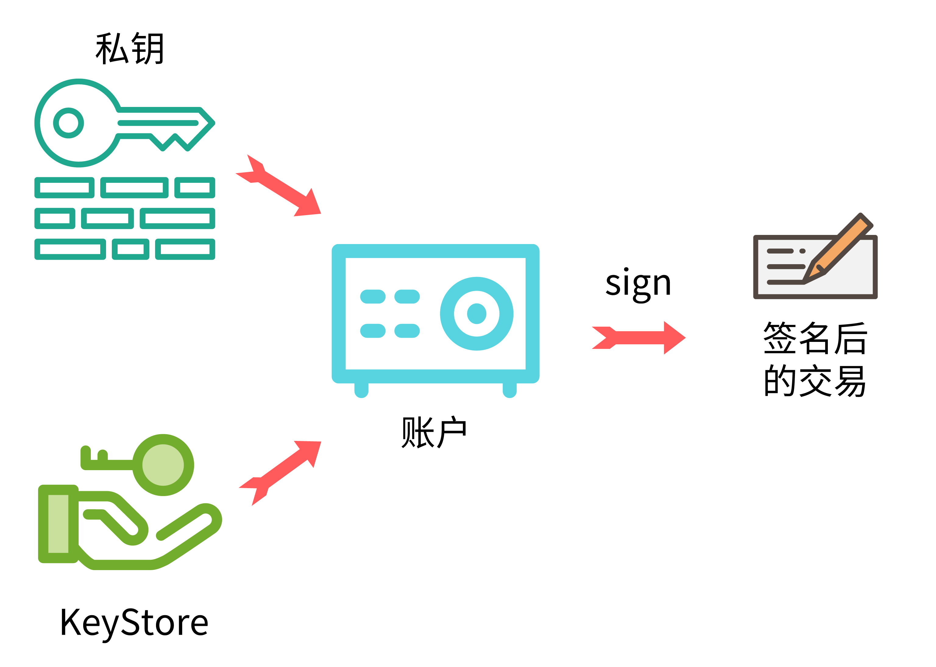 上面的代码中其实就是使用的PrivateKey进行了签名,使用的方法是web3a.platon.accounts.signTransaction方法,这个方法直接接收transaction和privateKey两个参数,返回一个signedTransaction。这种方便其实算一个便捷工具,快速的生成了一个签名的交易。为了使代码逻辑更清楚,我们推荐使用私钥(PrivateKey)或者KeyStore生成一个账号(Account)然后用账号进行签名。如下图所示: